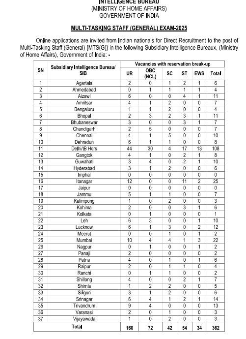 Ministry of Home Affairs, Government of India has released the official notification for direct recruitment to 362 posts of Multi-Tasking Staff (General) – MTS (Gen) in Group-C (Non-Gazetted, Non-Ministerial) in various Subsidiary Intelligence Bureaux.