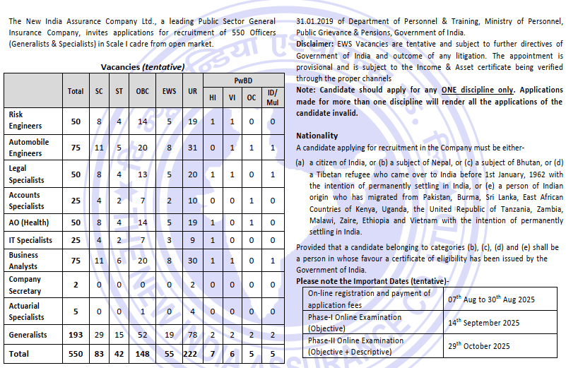 The New India Assurance Company Limited (NIACL) has released the 2025 recruitment notification for 550 Administrative Officer (AO) Scale-I vacancies, covering both Generalist and Specialist streams. The online application period is from August 7 to August 30, 2025. Candidates must be Indian citizens or meet specific nationality criteria and be between 21 to 30 years old as of August 1, 2025, with age relaxations applicable for reserved categories.