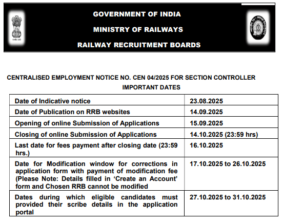 The Railway Recruitment Board (RRB) has released CEN No. 04/2025 for the section controller post. A total of 368 vacancies are available for the graduates aged 20 to 33 years. Applications for this vacancy exam can be submitted online from 15 September to 14 October 2025. The vacancy exam includes CBT, CBAT, and document verification stages.