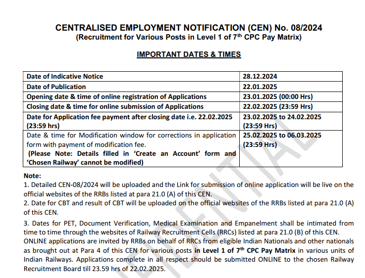 Various Level-1 posts (Track Maintainer Grade-IV, Helper/Assistant, Hospital Attendant, Pointsman, Porter, Gate-man, etc.) in different departments of Indian Railways Pay: Rs 18,000 (Level-1 of 7th CPC) + allowances Age (as on 01.01.2025): 18–36 years (Special one-time 3-year upper age relaxation for all candidates due to COVID-19 impact) Normal relaxation for SC/ST/OBC/EWS/PwBD/Ex-SM as per rules