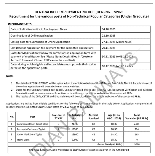 The Railway Recruitment Boards (RRB) have released CEN No. 07/2025 for the hiring of 3,058 Non-Technical Popular Categories (Under Graduate) positions, including Junior Clerk, Accounts Clerk, Trains Clerk, and Commercial Cum Ticket Clerk (2,424 posts). Important dates are as follows: October 28, 2025 is the opening date for online applications, and November 27, 2025 is the closing date. As of January 1, 2026, candidates must be between the ages of 18 and 30 and possess the necessary undergraduate degree.